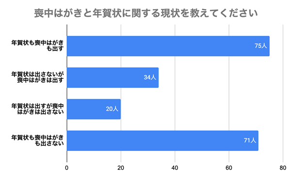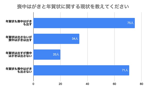 一方で、「喪中はがきだけ出す」(34人)、「年賀状だけ出す」(20人)という回答も見られ、年賀状・喪中はがきの扱い方は多様化していることがわかります。
