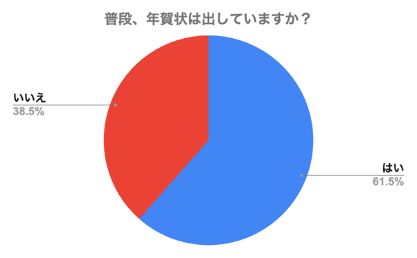 「普段、年賀状を出していますか?」という質問に対し、「はい」と答えた人は123人(61.5%)、「いいえ」と答えた人は77人(38.5%)でした。