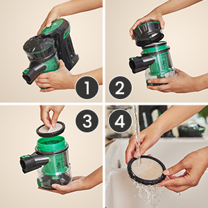 フィルターとダストカップは水洗いができ、いつでも清潔に保つことができます。