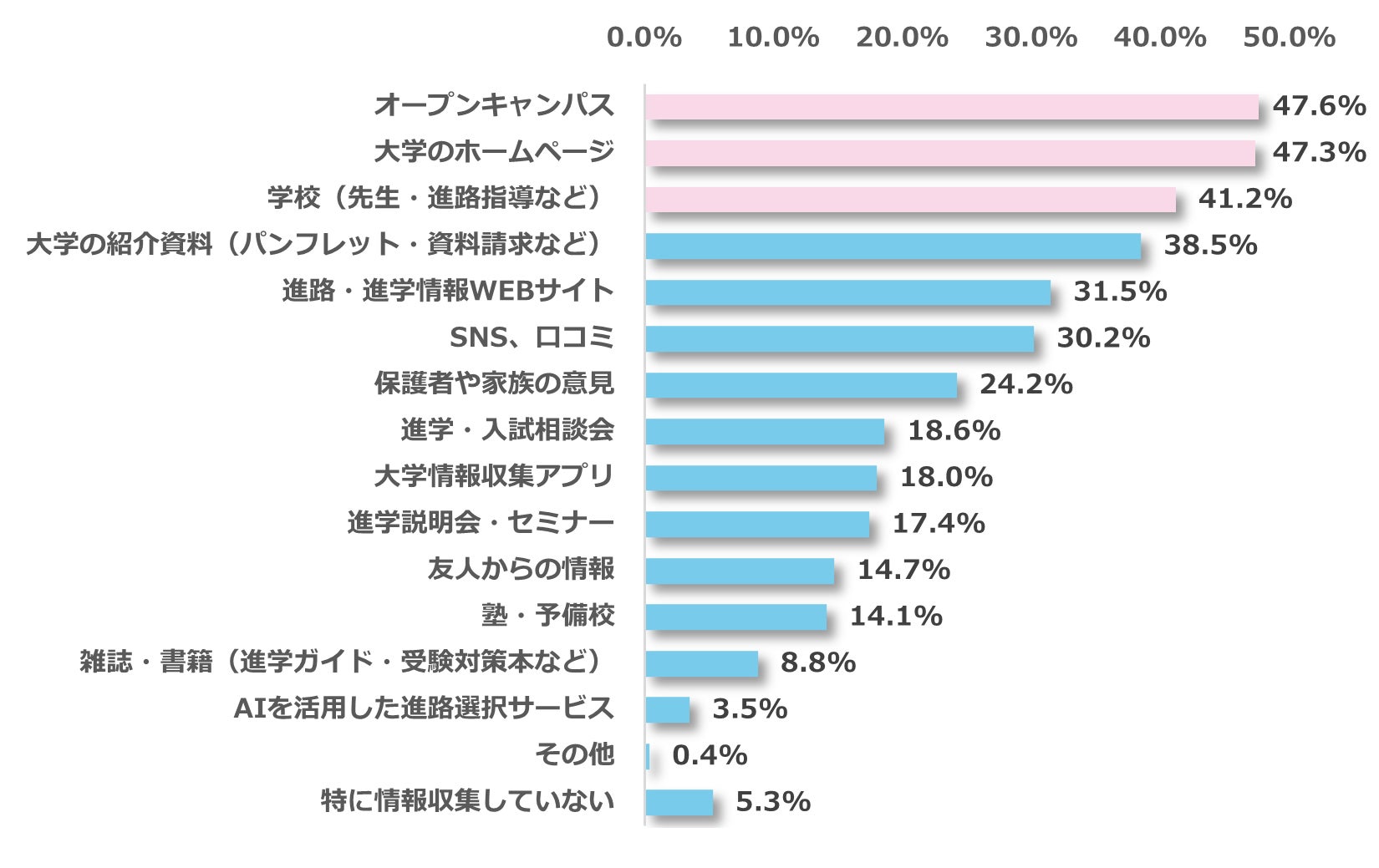 志望校の情報を得る方法について調査を実施しました。その結果、最多回答は「オープンキャンパス(47.6%)」、次いで「大学のホームページ(47.3%)」、「学校(先生・進路指導など)(41.2%)」と続きました。この結果から、多くの高校生が実際に大学の雰囲気を体感できるオープンキャンパスを重視しており、志望校選びの重要な判断材料として活用していることがわかります。