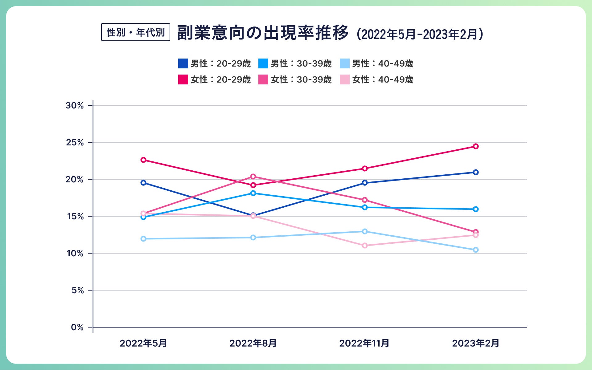今後半年の副業意向と回答者の性別・年代データを照らし合わせて見てみると、20代男女では、2022年5月よりわずかに副業意向が増加している一方で、40代男女や30代女性ではやや減少傾向にあります。全体で見ると、時期によりわずかな動きはあるものの、ほぼ横ばいであることが分かります。