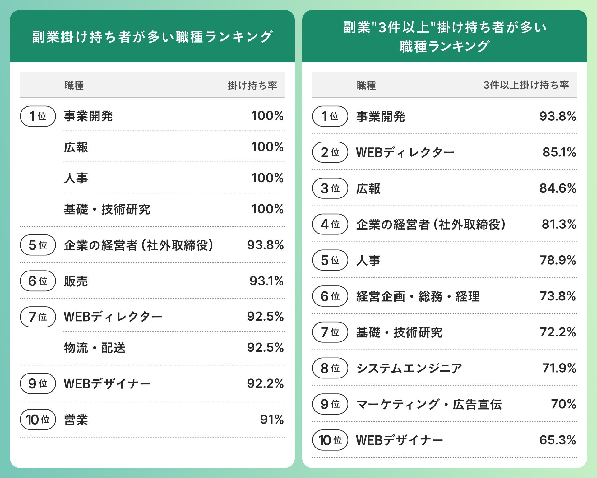 »人事、広報、事業開発などの職種で副業の掛け持ち率が100%に