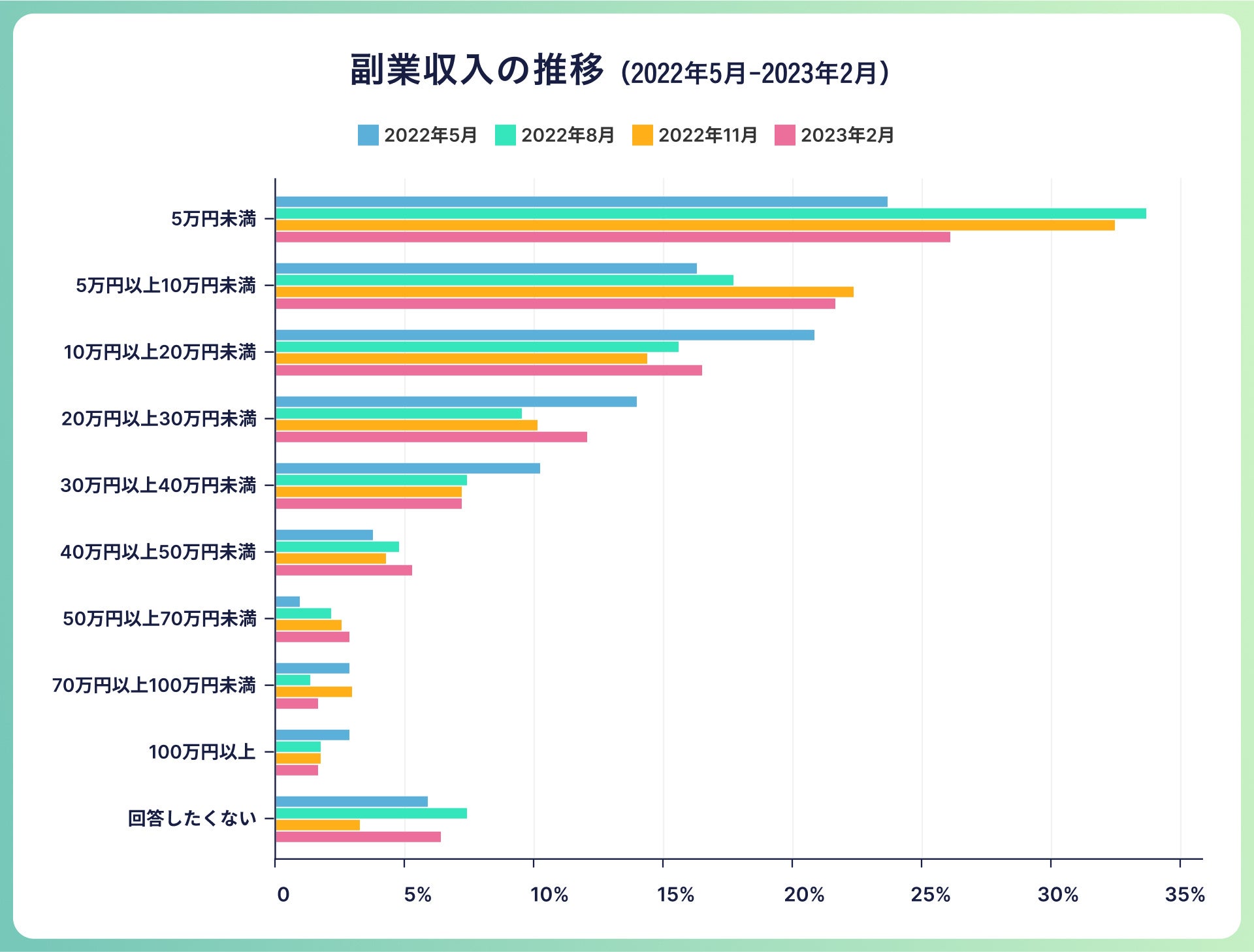 副業収入を2022年5月から比較してみると、「5万円未満」と回答した方が、2022年8月より減少していました。「5万円以上10万円未満」は11月よりは減少したものの5月と比べると増加していることが分かります。「50万円以上70万円以上」はわずかではありますが、5月から右肩上がりになっています。