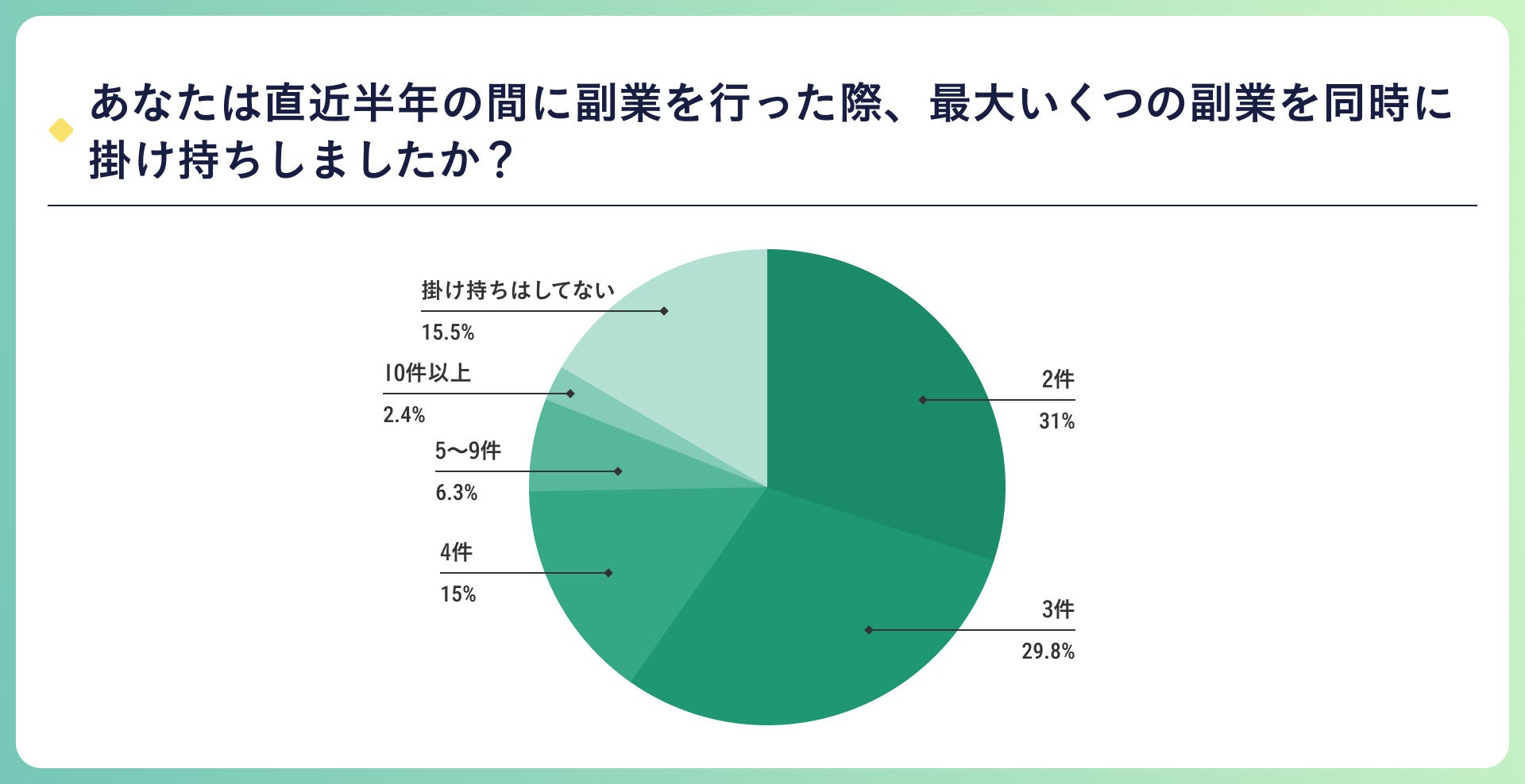 「あなたは直近半年の間に副業を行った際、最大いくつの副業を同時に掛け持ちしましたか?」と尋ねたところ、「2件」同時に掛け持ちした方が最も多く、31%となりました。次いで「3件」の掛け持ちが「29.8%」でした。全体で見ても、80%以上の方が2件以上掛け持ちした経験があることが分かりました。