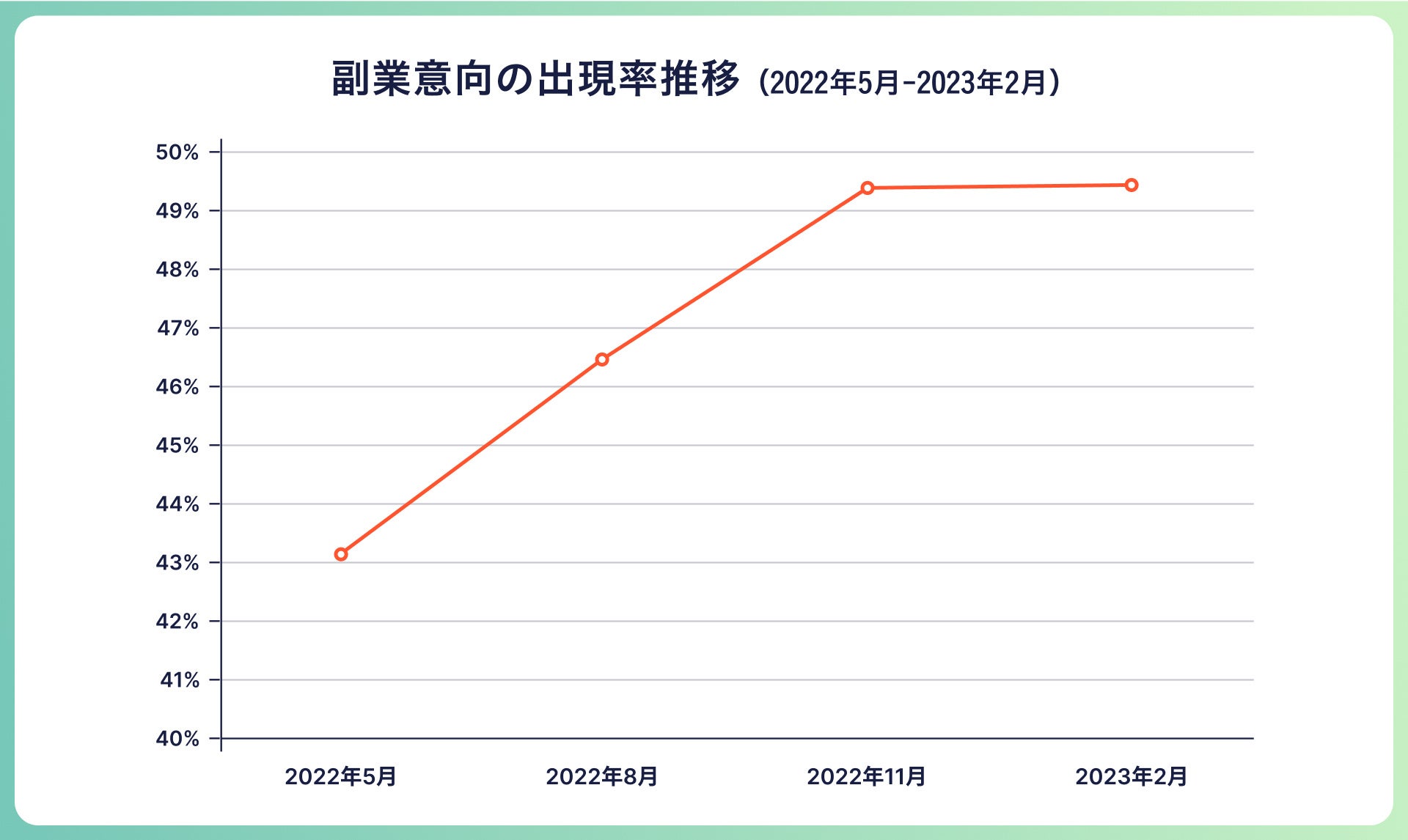 「あなたは今後半年の間に、副業を行うつもりはありますか?」と尋ねたところ、「実施するつもりだ」と回答した方は、49.5%となりました。2022年5月から11月は、5月が43.2%、8月が46.6%、11月は49.4%と増加傾向にありましたが、2023年2月は49.5%で前月から横ばいとなりました。
