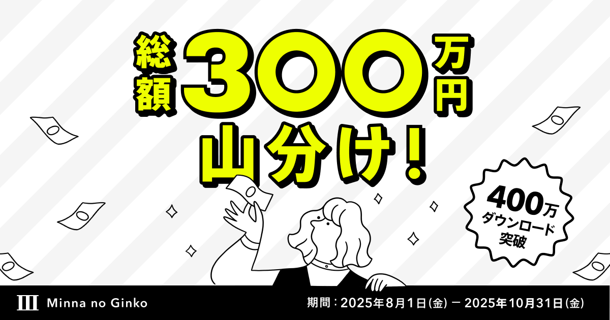 株式会社みんなの銀行(取締役頭取 永吉 健一、以下「みんなの銀行」)は、2025年8月1日から2025年10月31日までの期間、すべてのお客さまを対象に、「貯めて、使ってダブルでお得!総額300万円山分けキャンペーン」を実施します。
