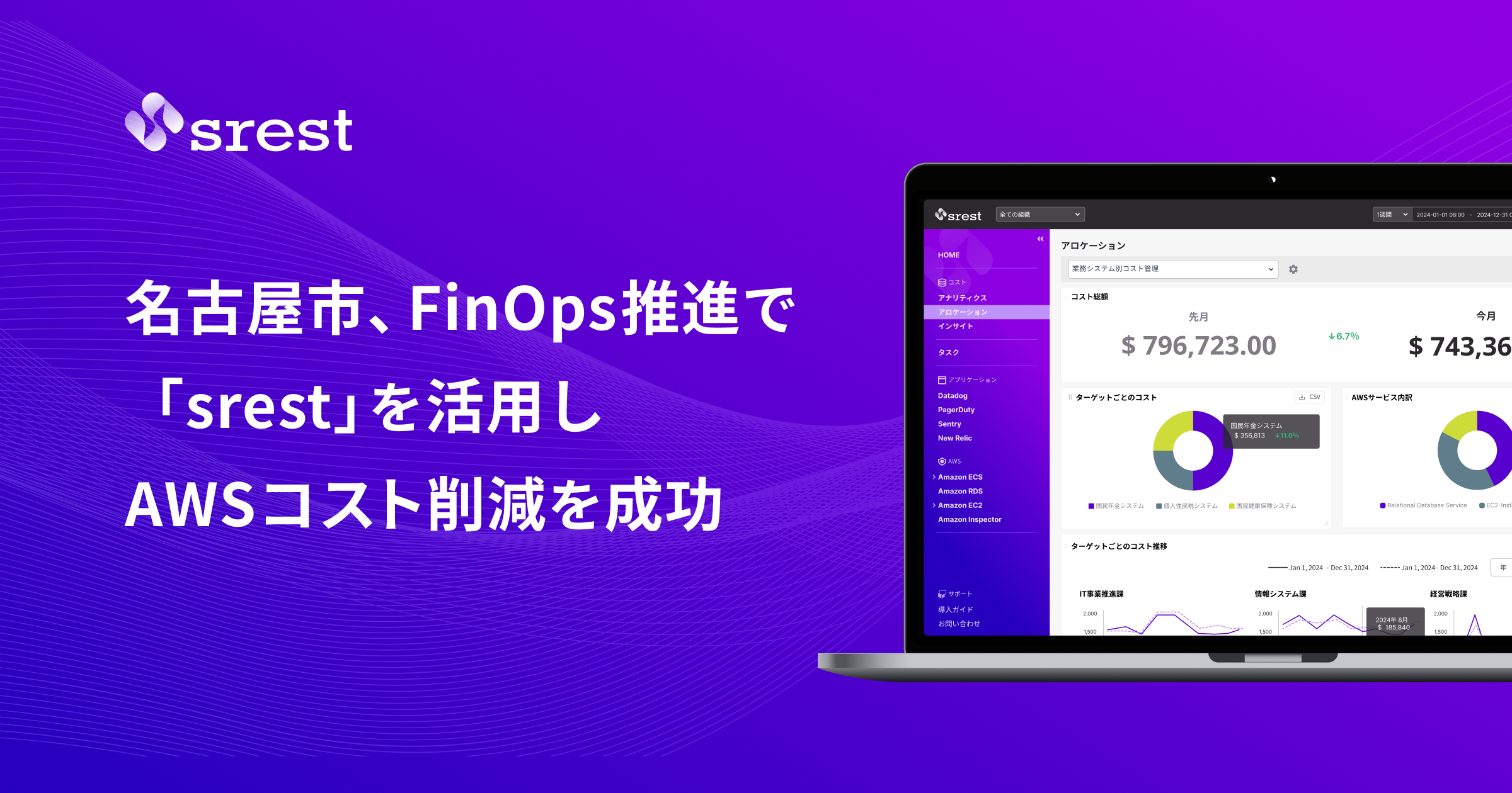 株式会社メタップスホールディングス(渋谷区、代表取締役社長 山﨑祐一郎)が提供するAWSコスト管理ツール「srest(スレスト)」は、愛知県名古屋市での導入事例を2025年9月24日(木)より公開します。同市では、2025年3月に実証実験を実施し、同年6月に正式導入。運用開始から3ヶ月で業務効率化とAWSコストの削減に成功しました。本事例は、ガバメントクラウド環境におけるFinOps推進の先進的な取り組みとして、全国自治体におけるコスト最適化のモデルケースとなることを目指します。
