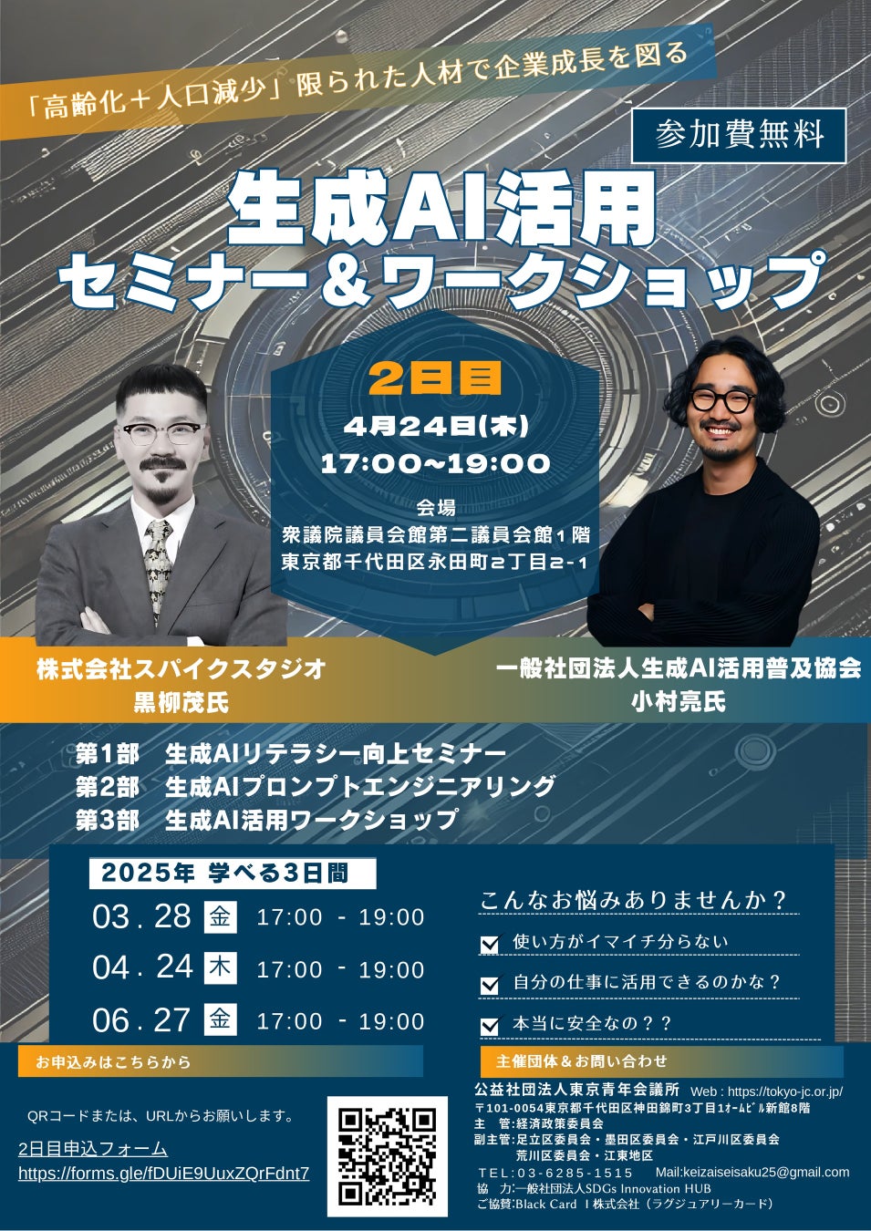 公益社団法人東京青年会議所(以下「東京青年会議所」)は、高齢化や人口減少といった社会課題に対応し、限られた人材で企業成長を図ることをテーマに、「生成AI活用セミナー&ワークショップ」の第2回目を4月24日(木)に開催いたします。