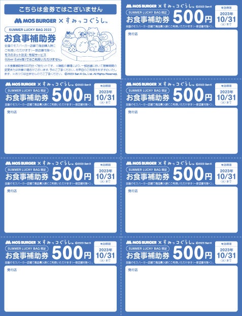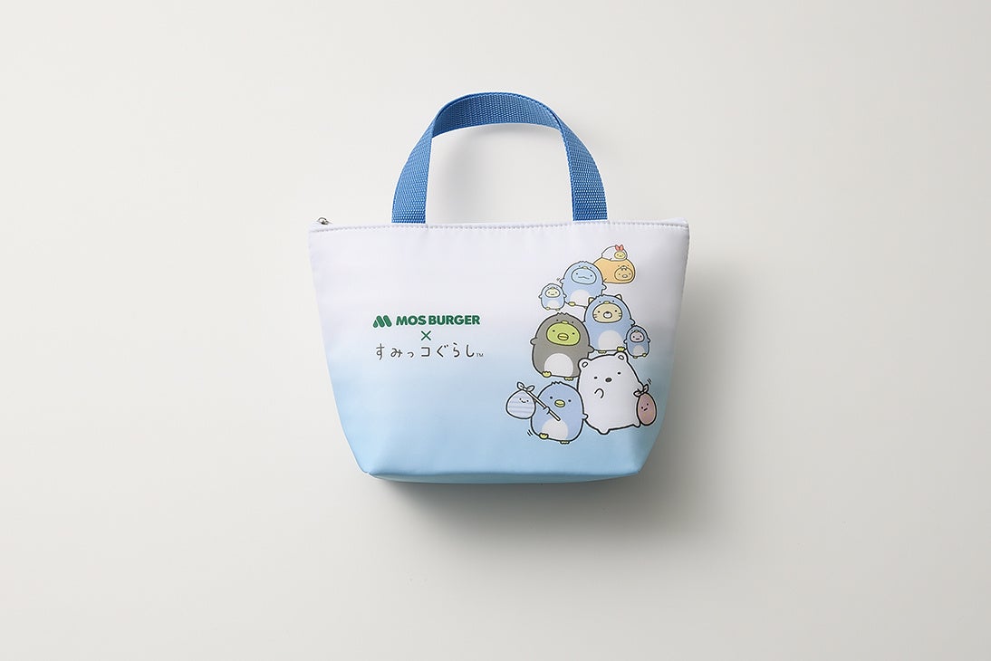 サンエックス株式会社の人気キャラクター『すみっコぐらし』とコラボし、「ひんやり夏をすごそう」をテーマにしたオリジナルグッズをご提供します。コラボグッズは、モスバーガーと『すみっコぐらし』のオリジナルイラストをあしらった、使い勝手のよい4種類の雑貨です。「お食事補助券※ 3,500円相当(500円×7枚綴り)」も一緒に、すみっコぐらしデザインの専用袋に入れてご提供します。