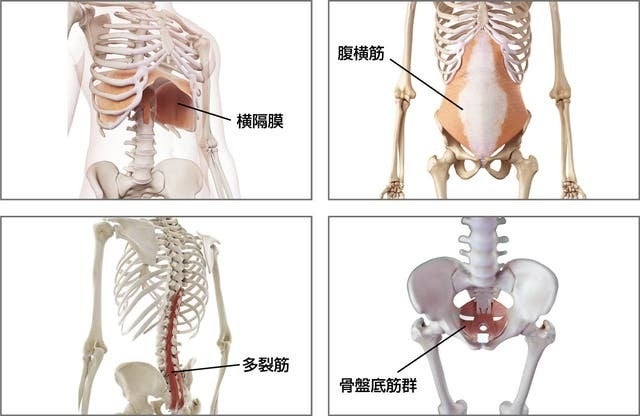 上図の横隔膜、多裂筋、腹横筋、骨盤底筋群といったお腹まわりの筋肉が刺激!