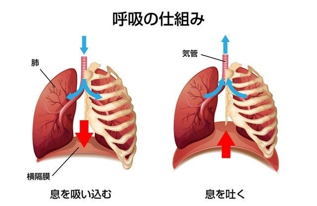 腹式呼吸を行うと、お腹の内側の筋肉である横隔膜、多裂筋、腹横筋、骨盤底筋群が刺激されます。姿勢を意識したり、お腹の筋肉に集中したり、多くの酸素を取り込んだりすることで、人間の活動の基本となる生理現象に影響を与える要素が呼吸には含まれています。そのため、正しい呼吸法を身につけることが重要です。