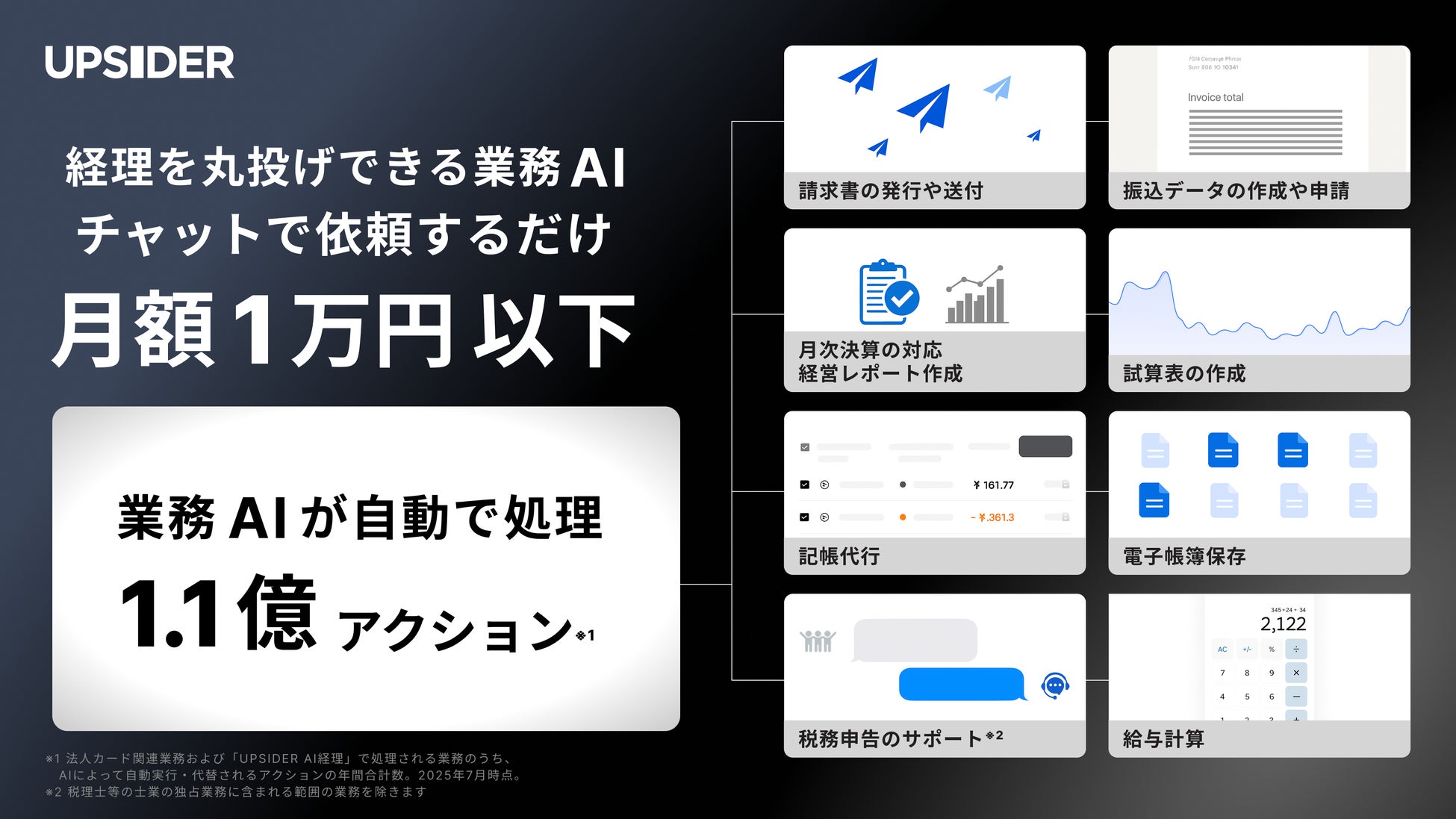*9 法人カード関連業務および「UPSIDER AI経理」で処理される業務のうち、AIによって自動実行・代替される年間合計処理件数の概算。2025年7月時点。
