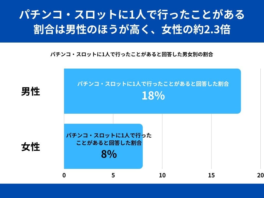 パチンコ・スロットに1人で行ったことがあると回答した割合を男女別でみてみますと、男性が18%、女性が8%という結果になりました。