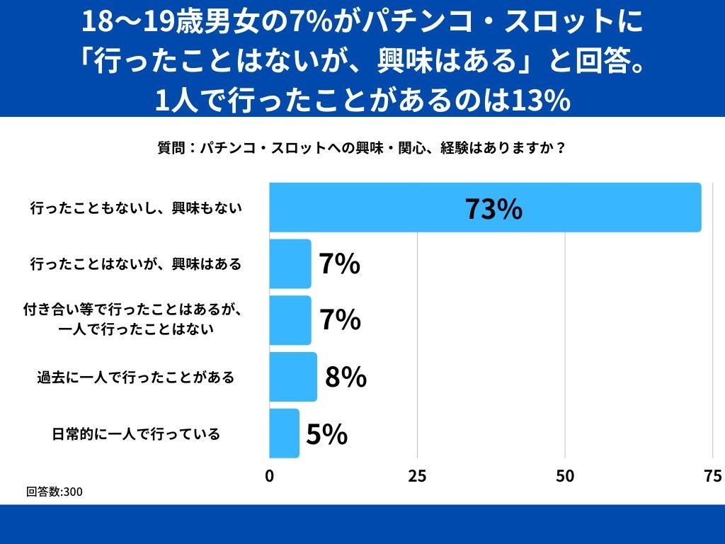 18~19歳男女の7%がパチンコ・スロットに「行ったことはないが、興味はある」と回答。1人で行ったことがあるのは13%【パチンコ・スロットに関するアンケート】