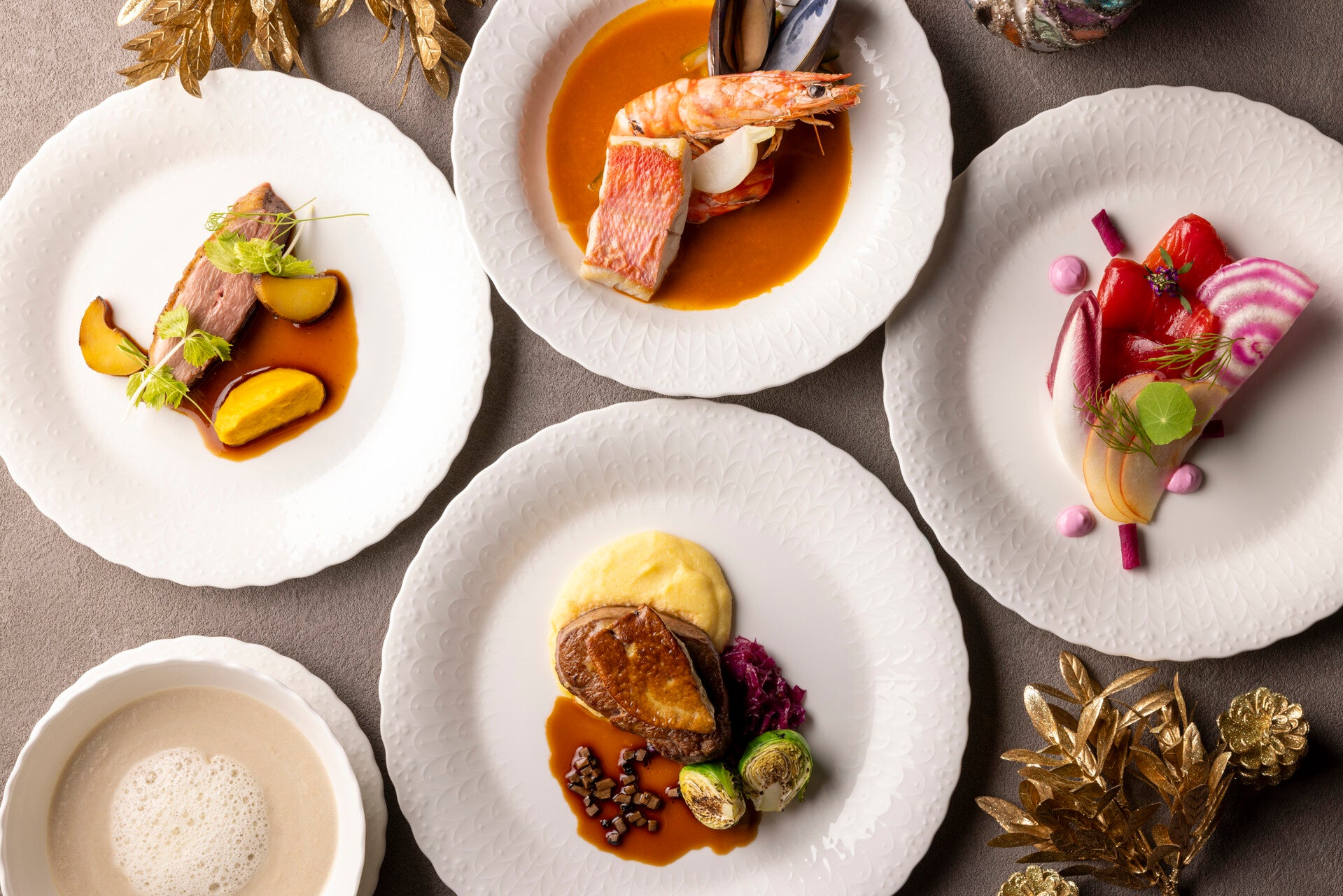 オニオンスープやパテなどのクラシックなフランス料理と共に祝うコース。愉しいお食事のひとときをフェスティブデコレーションが一層華やかに盛り上げます。
