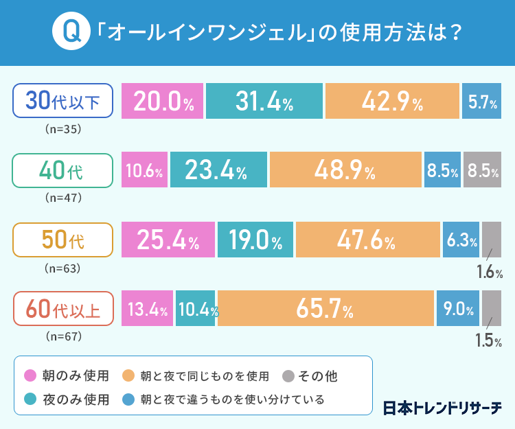 【オールインワンジェル】使用している30代以下女性の31.4%は「夜のみ使用」 年代による違いは?