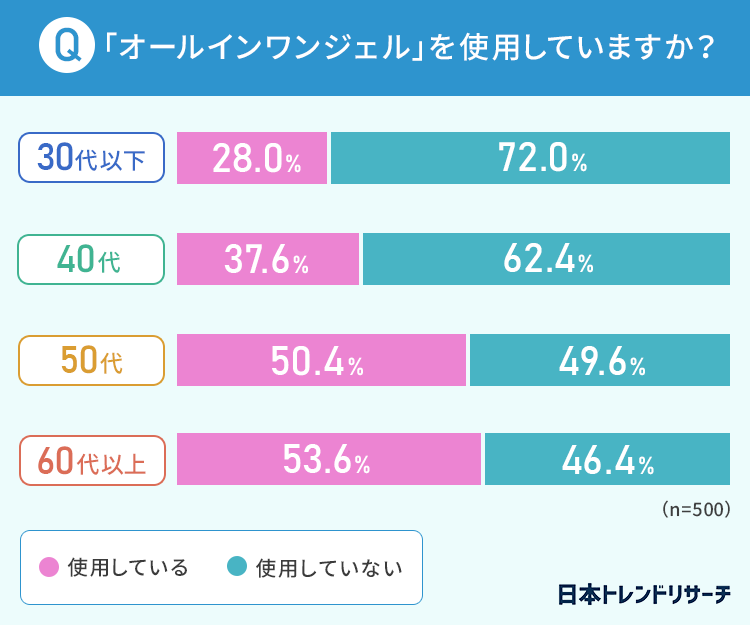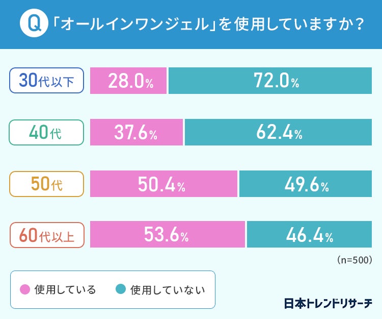 オールインワンジェルを使用している方の割合は、30代以下で28%、60代以上で53.6%となっており、年代が上がるごとに使用している方の割合が増える傾向にあるようです。