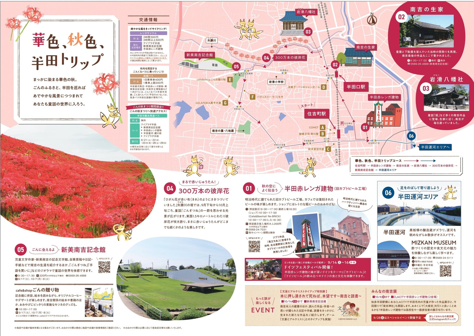 同キャンペーンは、半田市内の矢勝川周辺で毎年9月に見頃を迎える約300万本の彼岸花や、「新美南吉記念館」がある岩滑エリアにお出掛けいただくことを目的に、専用のポスターおよびリーフレットでの告知や、通年で発売している「半田散策きっぷ」「半田グルメきっぷ」に期間限定特典を追加します。
