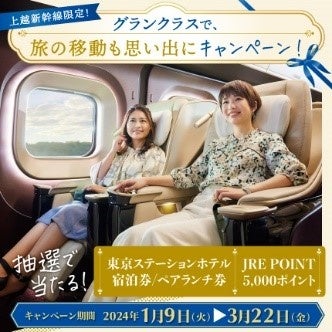 JR東日本新潟支社では、新幹線eチケットで上越新幹線のグランクラスをご利用のお客さまを対象に、東京ステーションホテルの宿泊券・レストランペアランチ券やJRE POINT 5,000ポイントが抽選で当たる「グランクラスで、旅の移動も思い出に」キャンペーンを、2024年1月9日(火)から開催します。