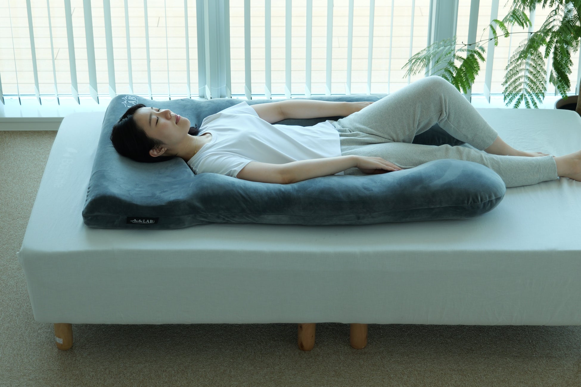ベッドを丸ごと枕化し、全身を包みこまれるかのような寝心地を体験できる巨大U字クッション。頭を乗せるピロー部分には、7段階で高さ調整ができるウレタンクッションを採用し、自分好みの理想の寝姿勢をとことん追求できる。