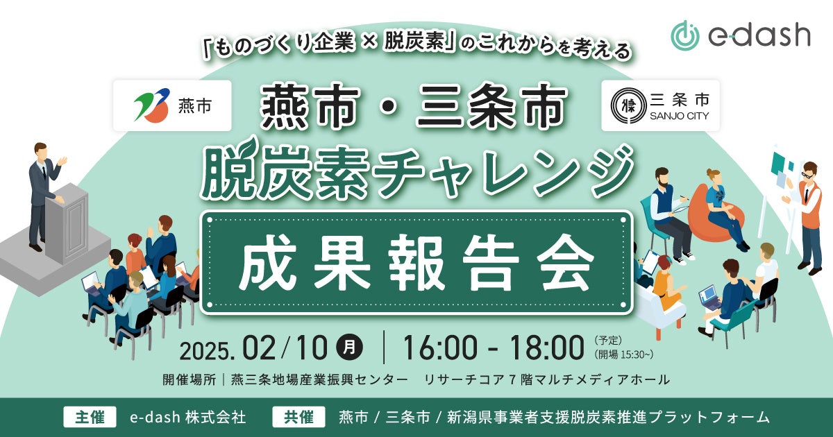 CO2排出量可視化・削減サービスプラットフォーム「e-dash」を提供するe-dash株式会社(本社:東京都港区、代表取締役社長:山崎冬馬、読み:イーダッシュ、以下「当社」)は2月10日(月)、燕市(市長:鈴木力)、三条市(市長:滝沢亮)、新潟県事業者支援脱炭素推進プラットフォームと共催で、当社と燕市、三条市が実施する市内中小企業を対象とした脱炭素支援プログラムの成果報告を通じて「ものづくり企業×脱炭素」のこれからを考えるイベントを開催します。