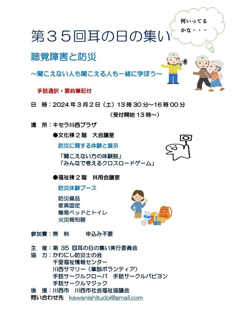 兵庫県川西市では、3月3日の「耳の日」にちなみ、3月2日(土)に「第35回耳の日の集い」(主催:第35回耳の日の集い実行委員会、後援:川西市、川西市社会福祉協議会)を開催。参加者に聴覚障がい者福祉について関心を持ってもらい、聴覚障がい者が災害時にどんなことに困るのかなど、聞こえについて理解してもらうと共に、聞こえない人も聞こえる人も一緒に防災について学ぶことが目的である。今回は、かわにし防災士の会などと協力し、防災に関する体験会などを行う。