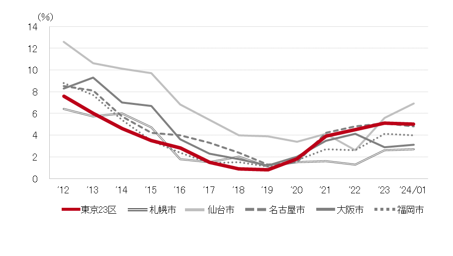 空室率は前月比マイナス0.06ポイントの4.91%と、前月から小幅に低下した。1月は大規模ビルの新規供給がなく、既存ビルで館内増床等により空室床の消化が進んだが、空室率は引き続き5%台目前で推移している。潜在空室率は前月比プラス0.20ポイントの7.60%となった。自社ビルへ移転するテナントの大口の募集床が生じ、主な上昇要因となっている。