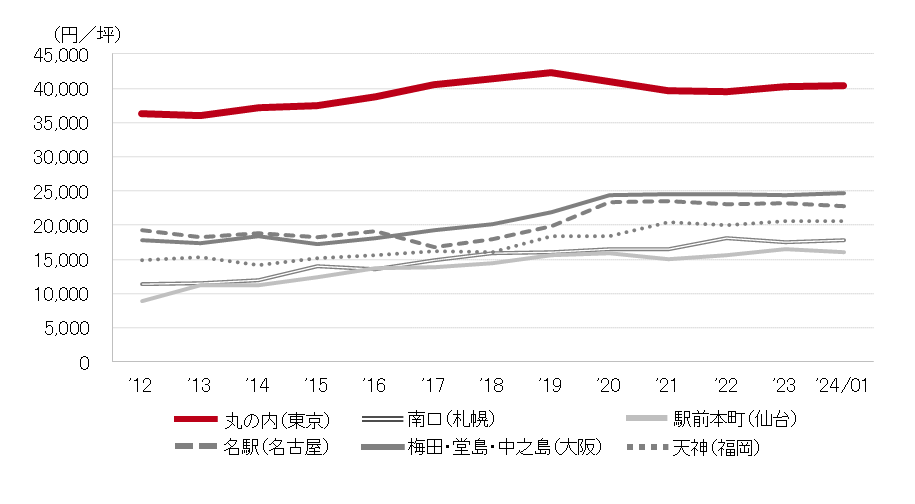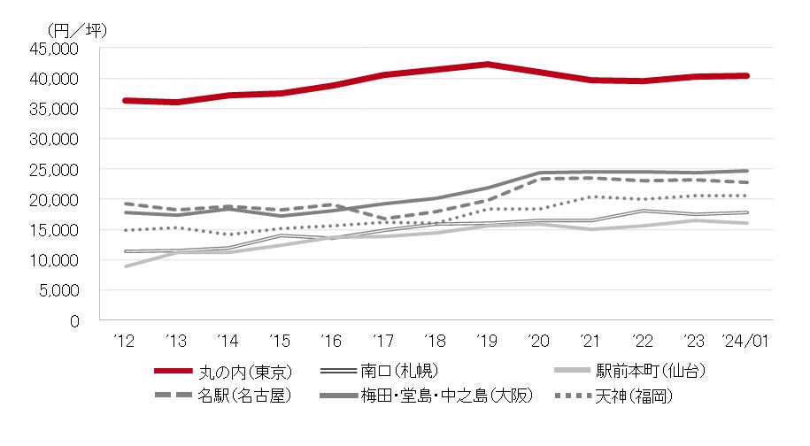 <募集賃料の推移(6大都市 大規模ビル・主要駅前地区)>