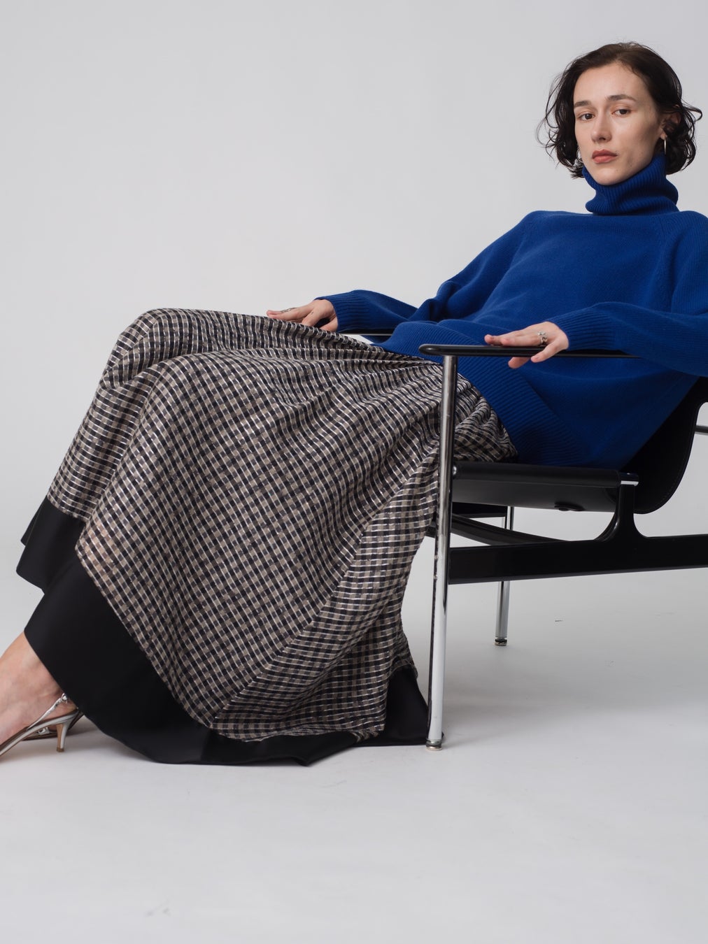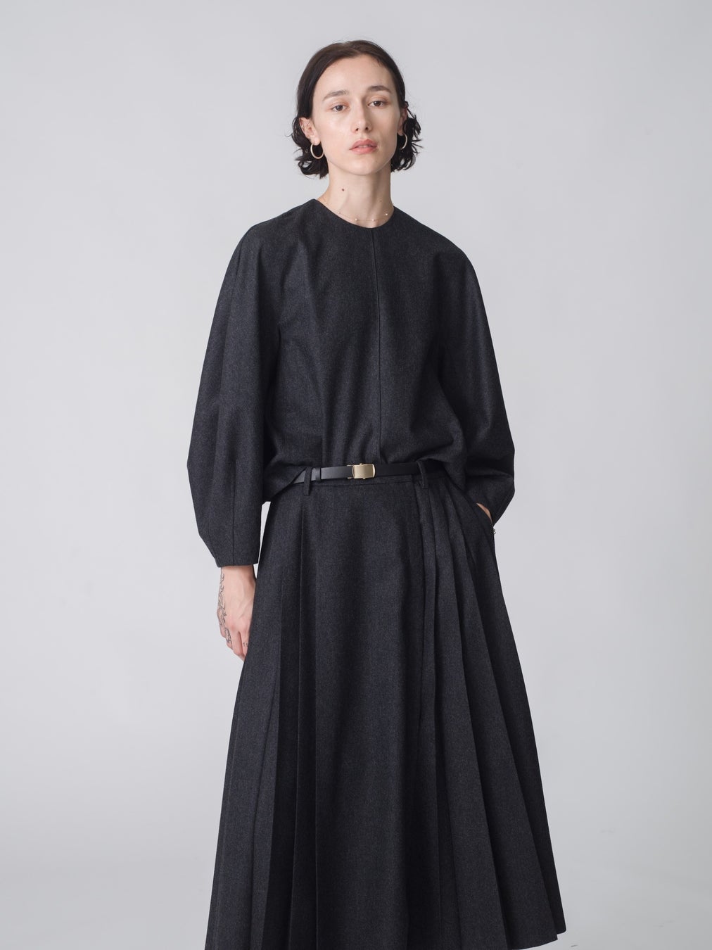 裾の切り替えをアクセントに、ランダムタックでボリュームを出したスカート。立体的なフォルムが生む動きと光沢が、素材の美しさを引き立てます。
