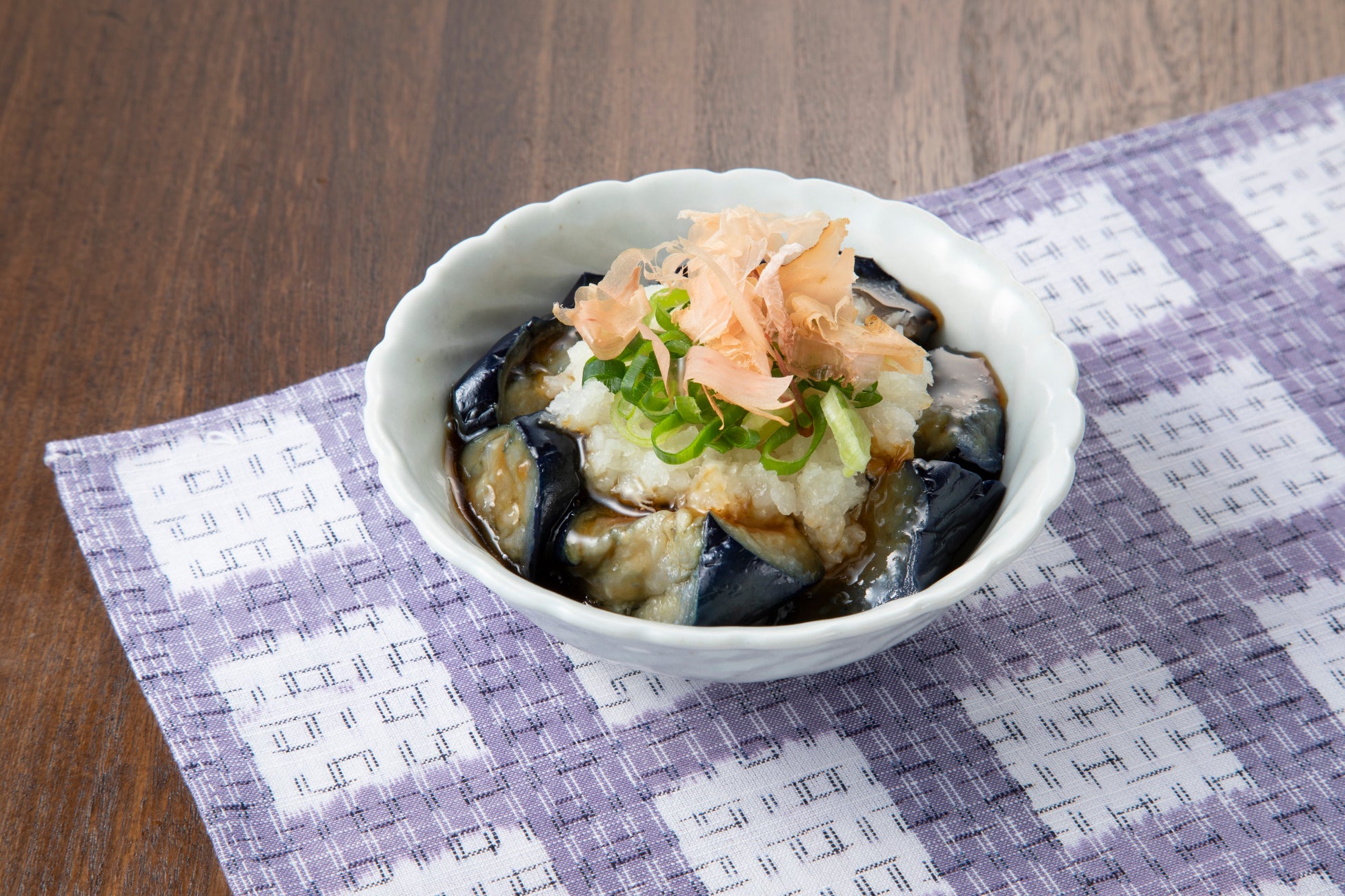 静岡県産茄子を使用し、甘めの味付けに仕立てた茄子の揚げ浸しです。粗おろし大根と鰹節を合わせてさっぱりと食べられる冷製のお惣菜です。