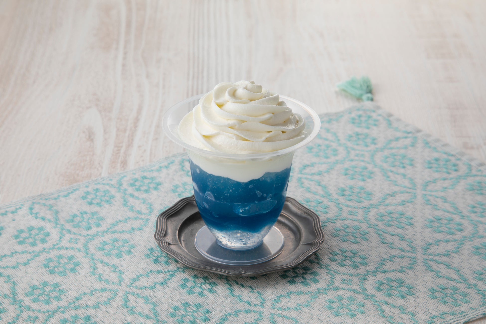 「ふじのくに富士山ミルク」を使用したホイップクリームと、さっぱりとした清涼感のあるソーダゼリーの組み合わせ。富士山を連想させるような見た目が特長のスイーツです。