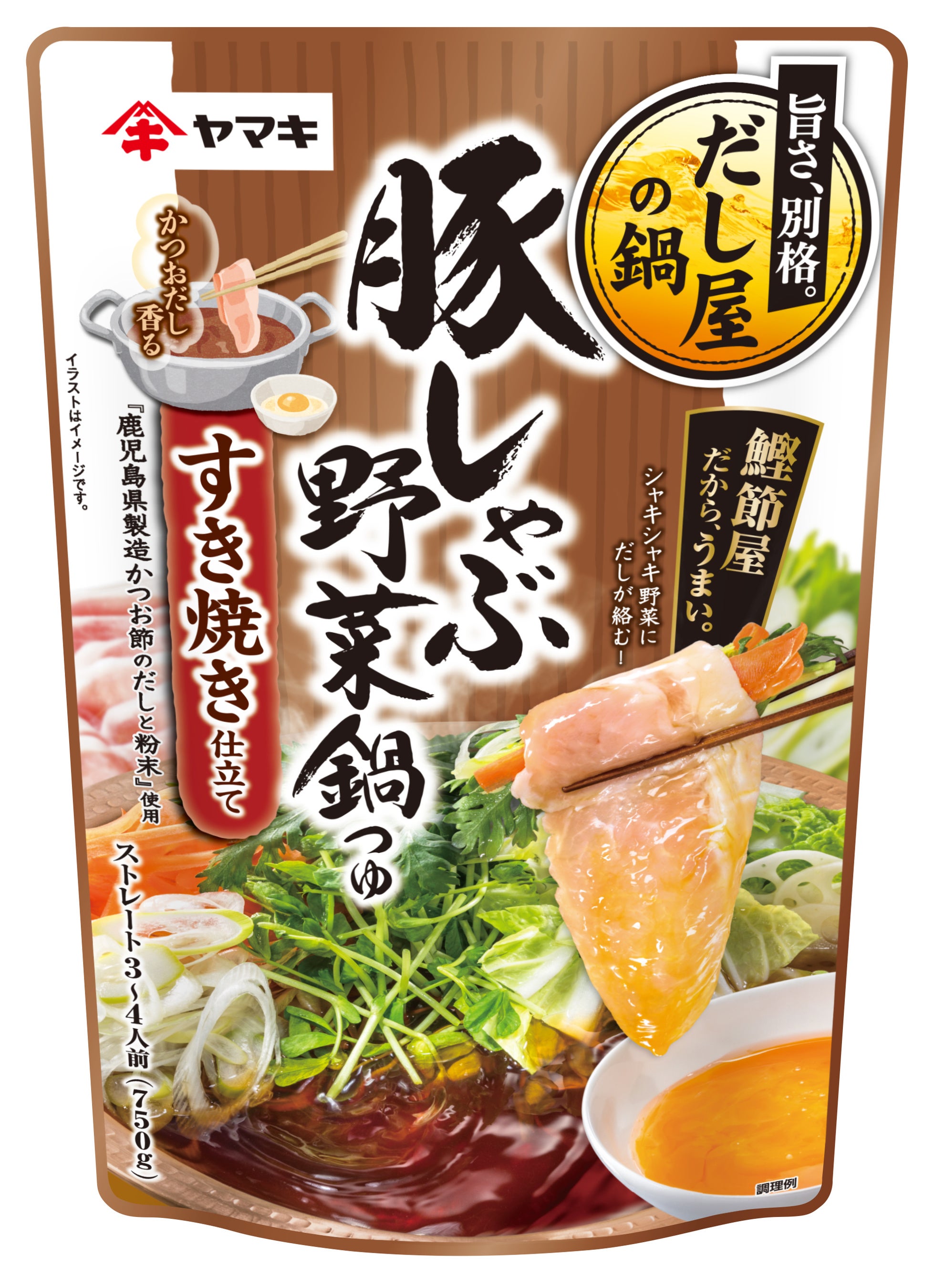 ヤマキ株式会社(本社:愛媛県伊予市 代表取締役社長:城戸善浩)は、人気の「豚しゃぶ野菜鍋つゆ」シリーズより、新たに「豚しゃぶ野菜鍋つゆ辛味噌にんにく750g」と「豚しゃぶ野菜鍋つゆ生姜白湯750g」の2品を発売いたします。また、シリーズ1の人気を誇る「豚しゃぶ野菜鍋つゆかつお750g」を、1人前ずつ使用できる個食タイプにした「豚しゃぶ野菜鍋つゆかつお26g×4袋」も発売いたします。