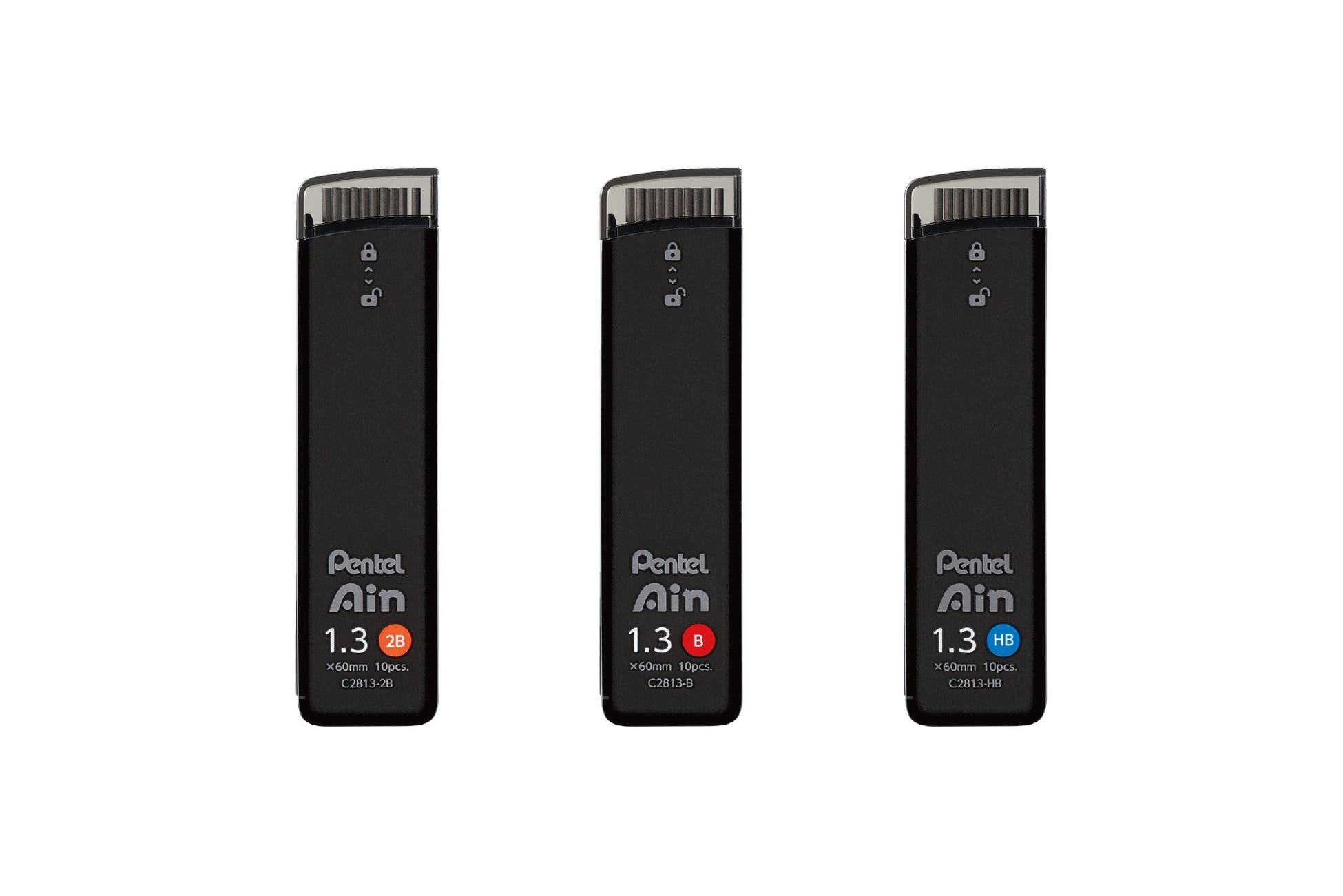 なめらかさが特長のシャープペン替芯「Pentel Ain(ぺんてるアイン)」の芯径1.3には、好みや使うシーンに合わせて選べる硬度2B、B、HBの3種類をラインナップしています。