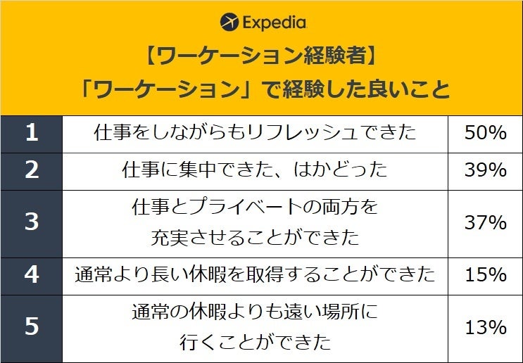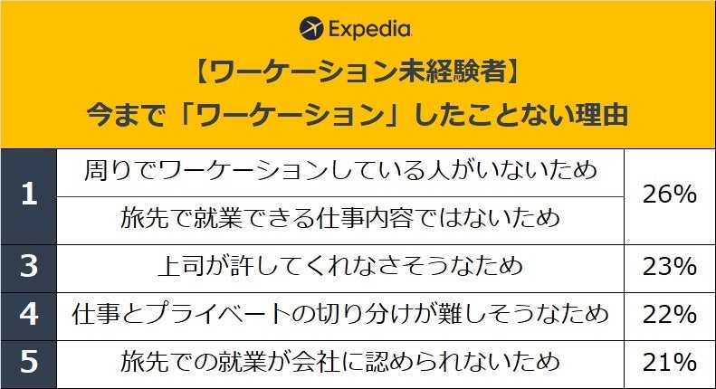 世界の大手総合旅行ブランドの一つであるエクスペディア(www.expedia.co.jp)は、20代~50代の正社員、または契約社員の男女を対象に「ワーケーション* に関する調査」を実施、これに合わせてエクスペディアおすすめのワーケーション先5選を発表します。