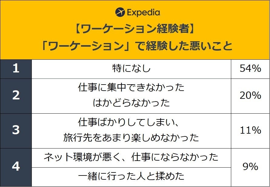 また、「ワーケーション」で経験した良いことについて聞いてみたところ、最も多かった回答は「仕事をしながらもリフレッシュできた(50%)」でした。次いで多かった回答が「仕事に集中できた、はかどった(39%)」、「仕事とプライベートの両方を充実させることができた(37%)」ということからも、仕事への良い影響があることが伺えます。さらに、経験した悪いことについて聞いてみたところ、54%が「特になし」と回答、「ワーケーション」において、半数以上の人が、特に悪いことはなかったと感じたようです。