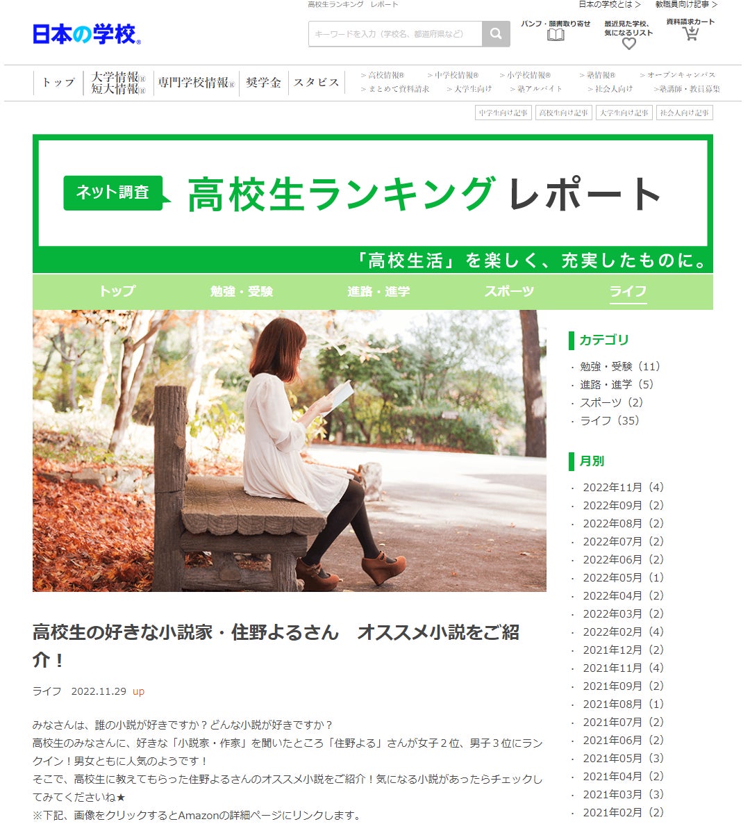 高校生ランキングレポート「高校生の好きな小説家・住野よるさんオススメ小説をご紹介!」:https://school.js88.com/koukousei/life/54
