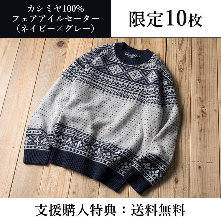 「カシミヤの本当の良さを知ってもらう」ために、伝統セーターの特徴である「肉厚でしっかりとした作り」を目指しました。伝統セーターの中でも、目を引くデザイン性があり、いつか挑戦したいと思っていたのが「フェアアイルセーター」。カシミヤのスペシャリストだからこそ実現できたベストプライスで、これからの冬に革命を起こします!