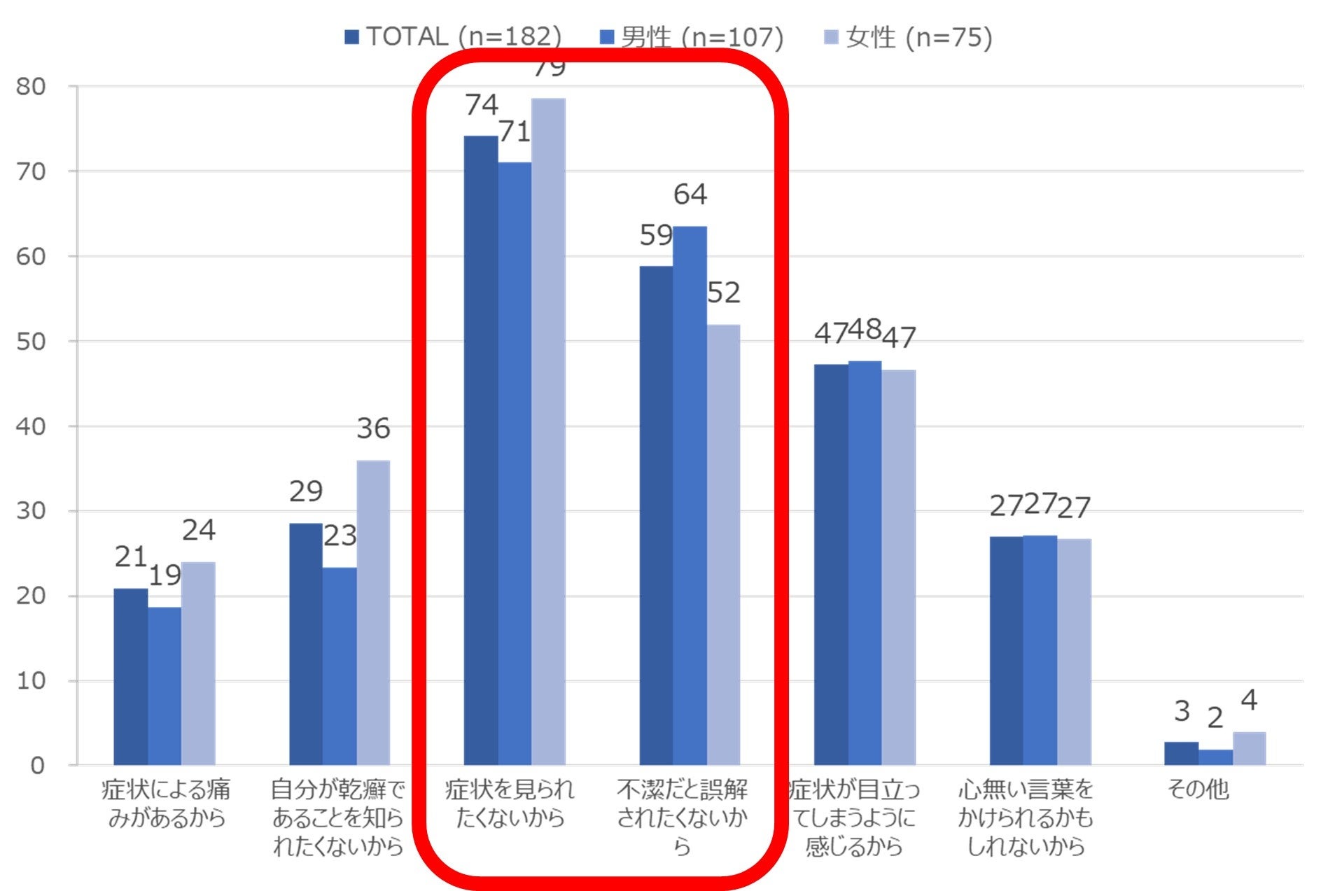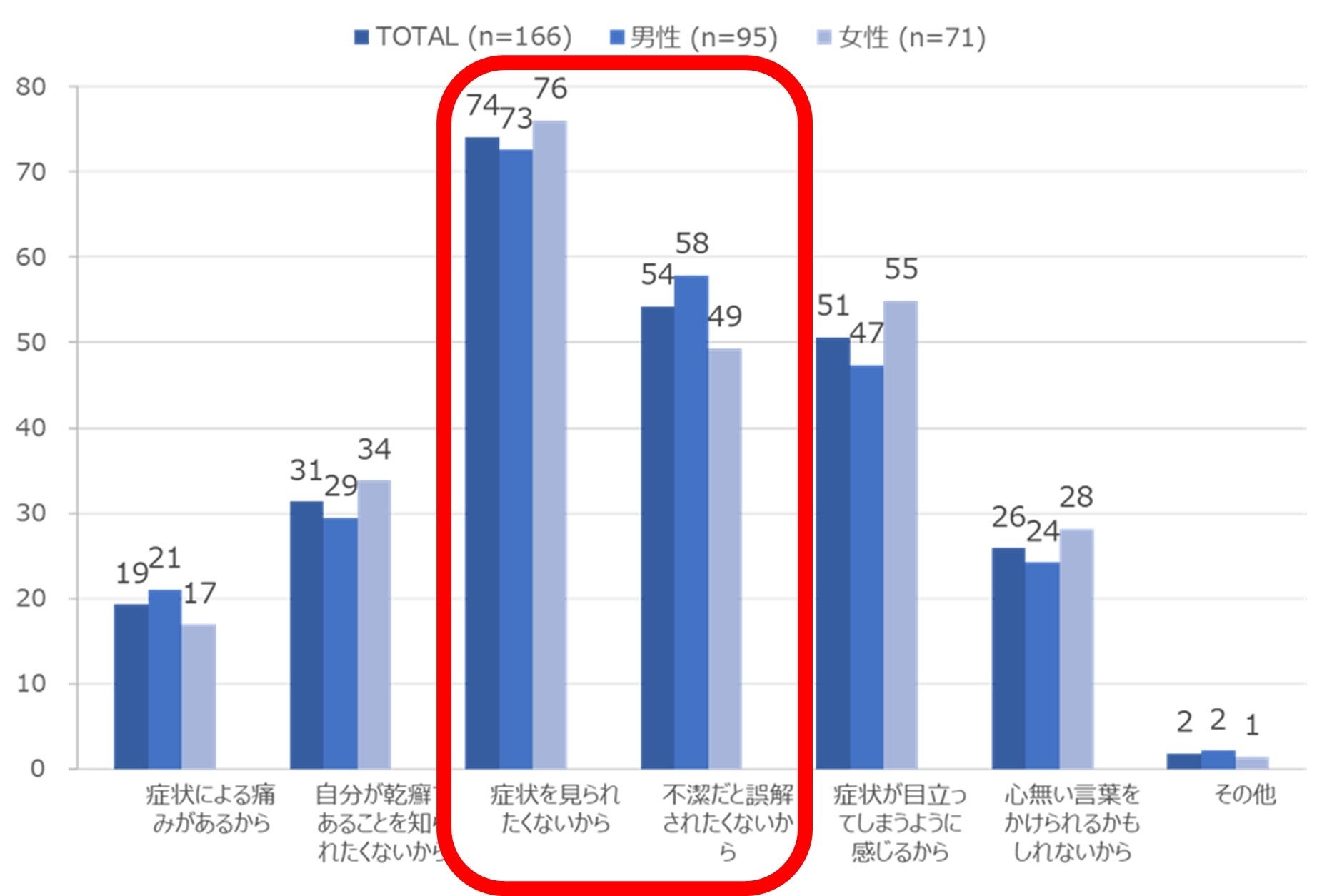 避けている理由は「症状を見られたくない」、「不潔だと誤解されたくない」から