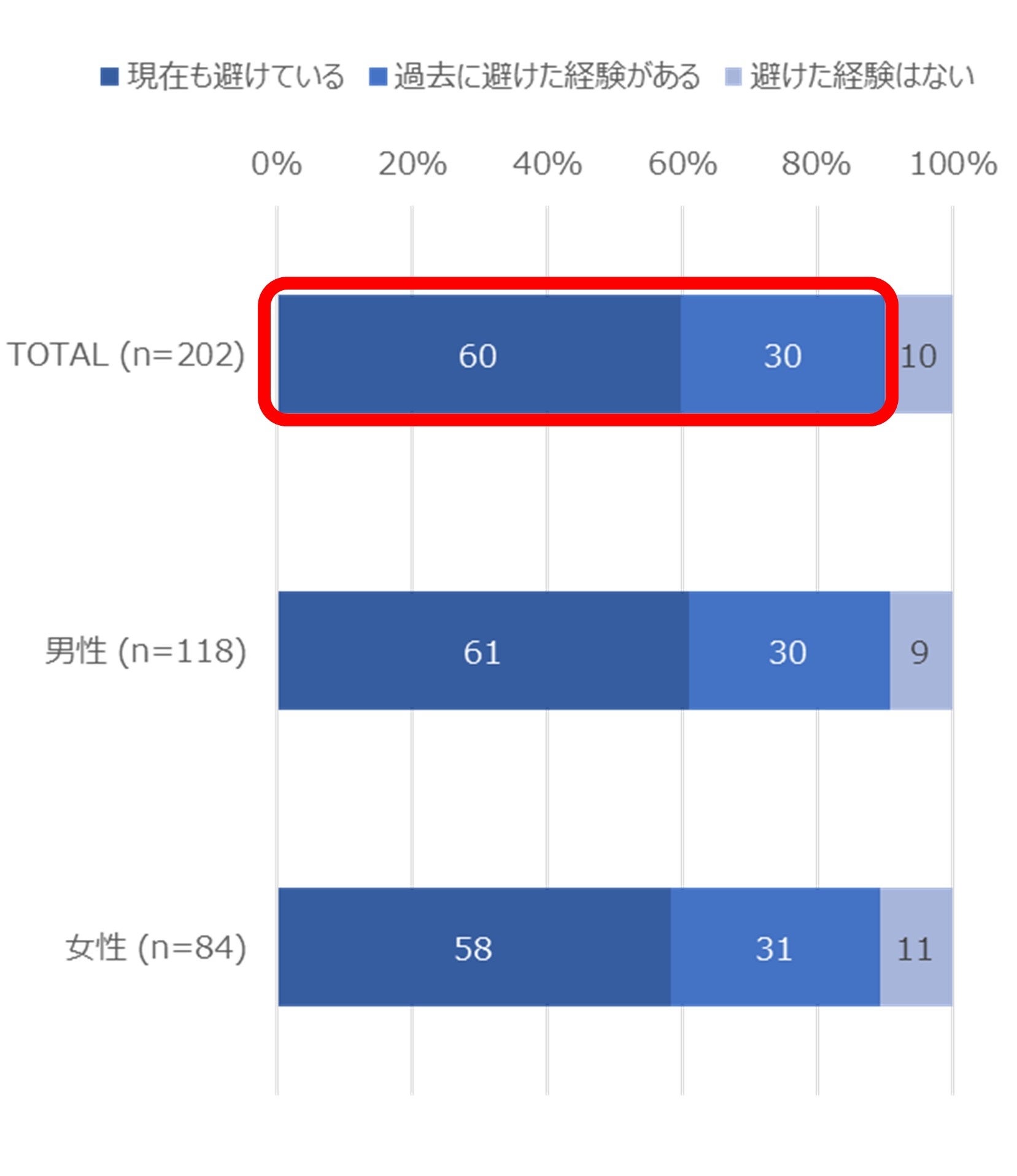 【図1】「温泉やプール、海などに行く」ことを避けた経験があると回答した人は90%(182/202人)を占め、その内訳は「現在も避けている(60%(121/202人)」、「過去に避けた経験がある30%(61/202人)」。