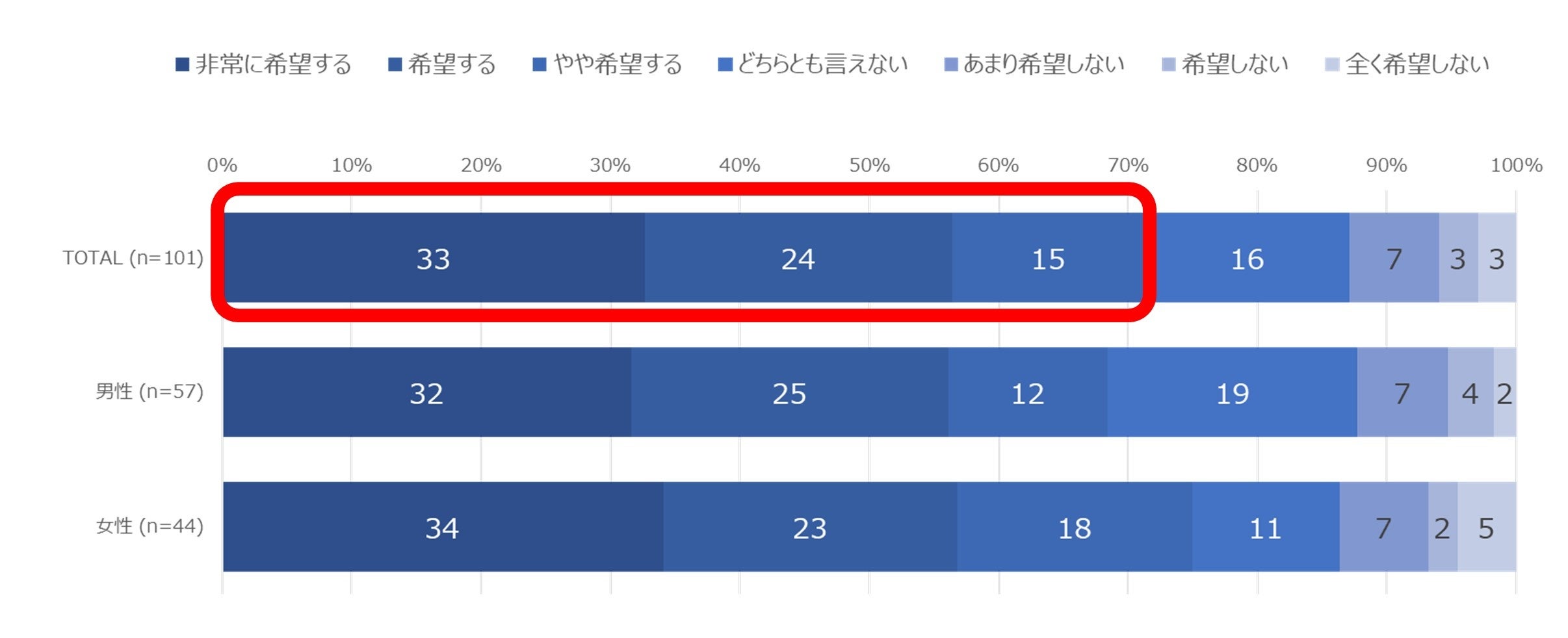 【図7】72%(73/101人)が「半袖やノースリーブなど、肌を露出する服を着て誰かと出かける」ことを希望する(非常に希望する、希望する、やや希望するの合計)