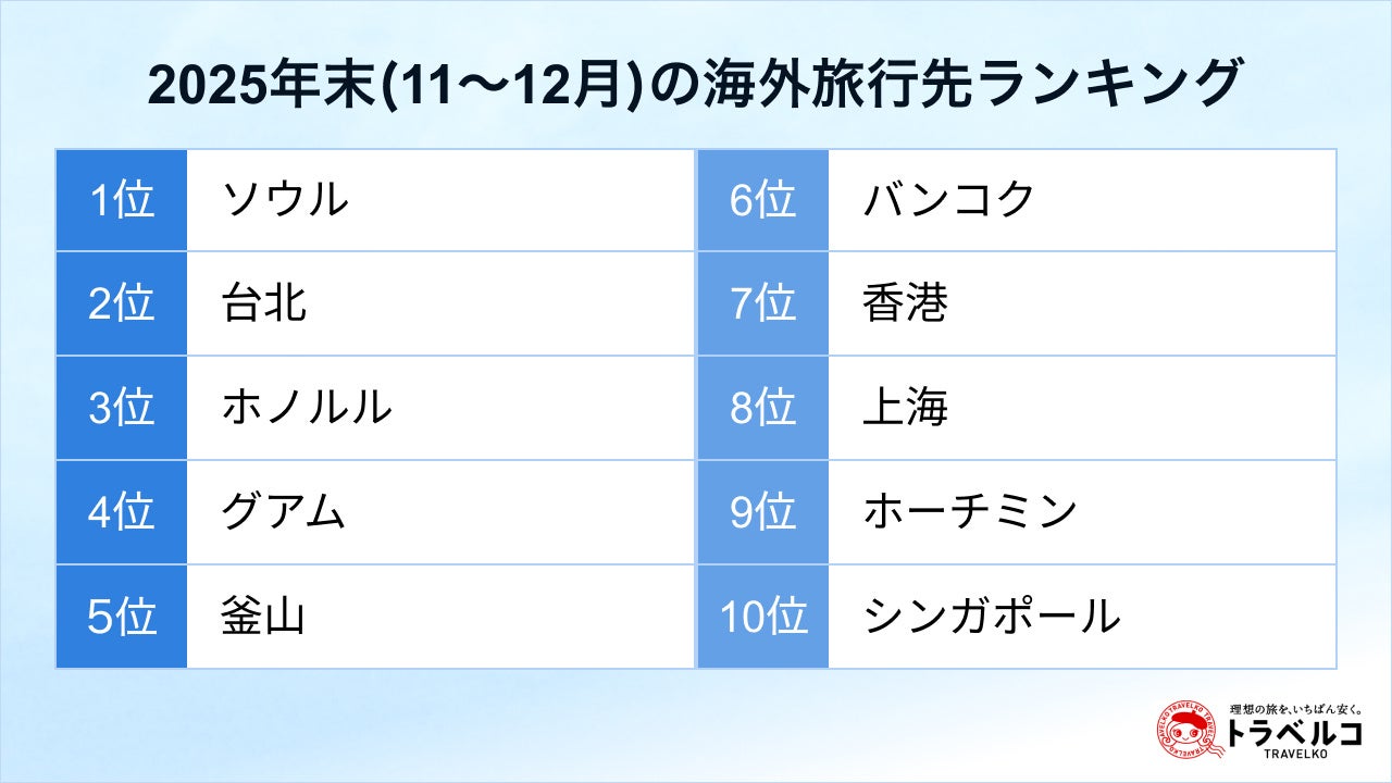 株式会社オープンドア(本社:東京都港区、代表取締役社長:関根大介)が運営する旅行比較サイト「トラベルコ」(https://www.tour.ne.jp/)は、サイト内の検索データをもとに、「2025年末(11〜12月)の海外旅行先人気ランキング」を発表いたしました。