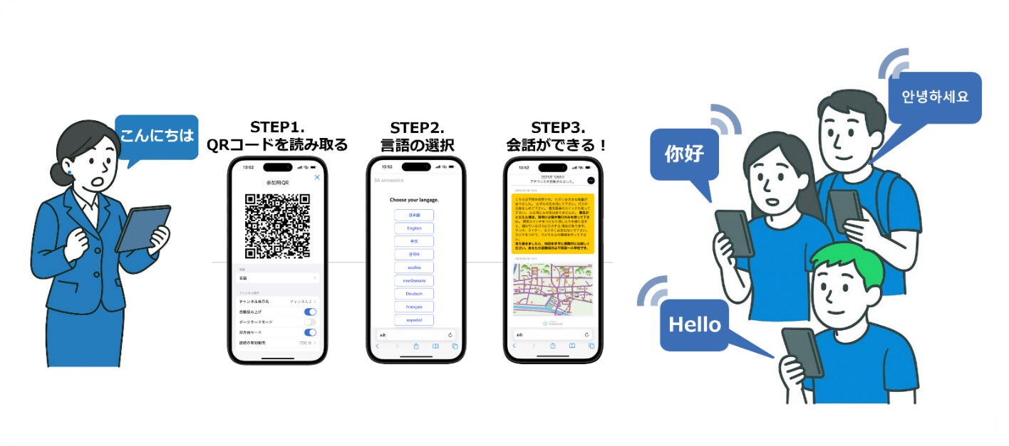 QRコードを読み取るだけで、各自の端末であらゆる言語で双方向にコミュニケーション可能。