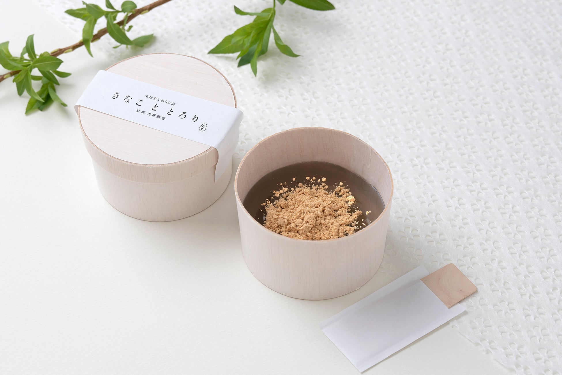 「とろりわらび餅 おひとりさま用」は、店舗にて既に販売されている「とろりわらび餅(プレーン)」の“とろり”としたたり落ちるような生仕立ての食感や、別添えの香り高い深みきな粉はそのままに、お一人さまや手土産にご利用しやすい食べきりサイズの新商品です。同封された深みきな粉をお召し上がりの直前に掛けていただくことで、より出来たてに近い状態でお召し上がりいただけます。また、手の中に納まる筒形のパッケージは、手土産やちょっとしたギフトにも最適です。