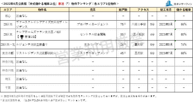 [住まいサーフィン]資産性の保たれやすいマンションがわかる首都圏エリア別「沖式儲かる確率上位マンションランキング」2022年6月版公表