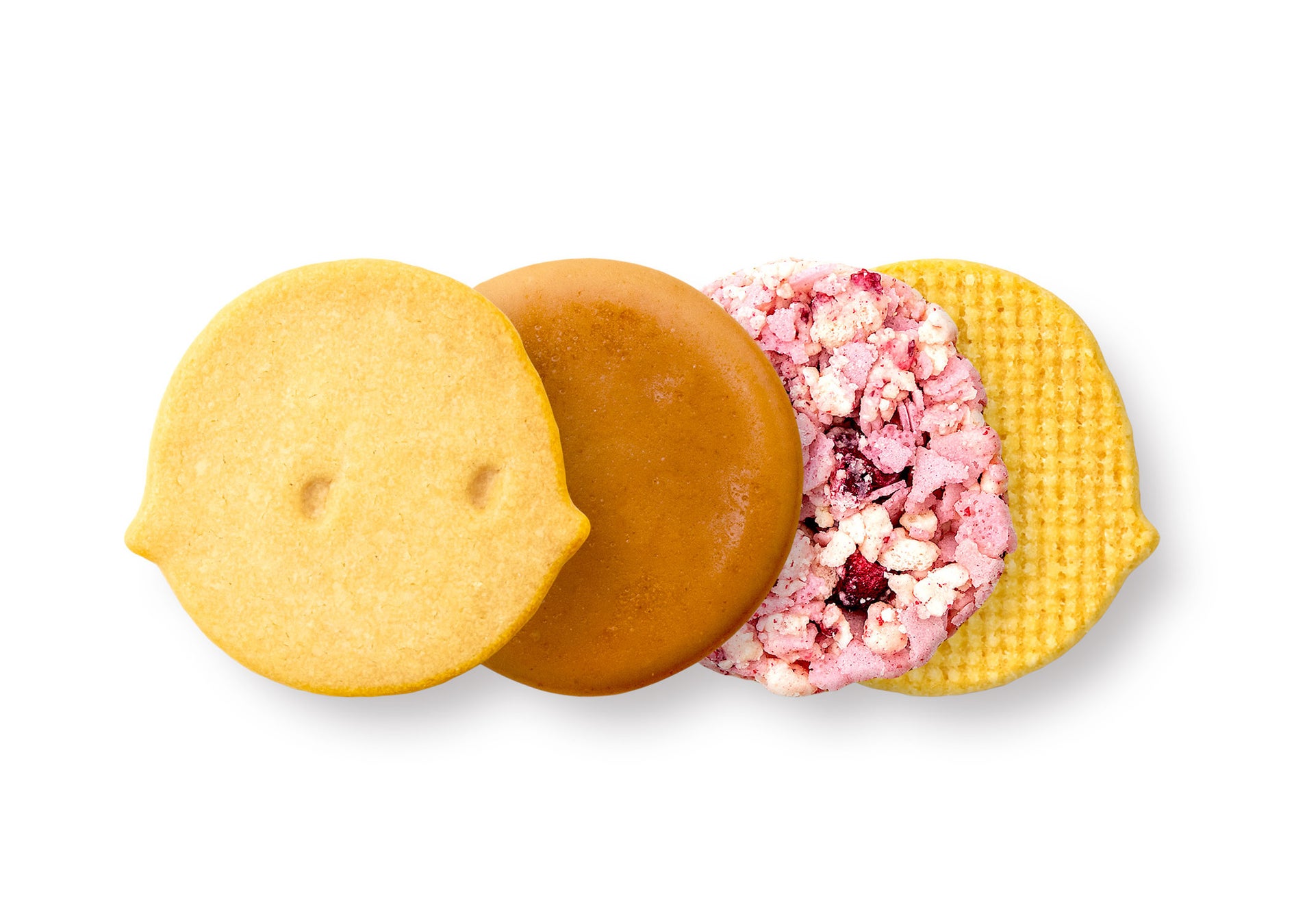 薄焼きのバタースカッチと、フリーズドライのフランボワーズとフィアンティーヌ入りのメレンゲショコラを、ミルフィーユサブレでサンドしています。フランボワーズのメレンゲがホワイトチョコレートバニラ香を吸収して薫り高くフルーティーなフレーバーに、メレンゲのサクサクの食感とフランボワーズの爽やかな酸味の今までにない新しいお菓子となっています。
