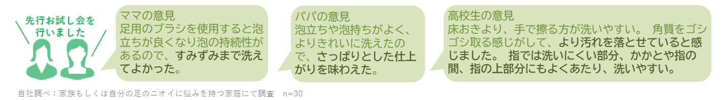 かかとの荒れ(かさつき・ひび割れ)、むくみ、水虫、汗・ムレ、ニオイといった足の悩みがある20代~60代の男女813名に、フットケア関連商品で使ってみたいアイテムを調査したところ、1位「かかとがつるつるになるフットブラシ」(29.3%)、2位「汚れ・角質がしっかり落とせるフットブラシ」(27.9%)という結果に。フットケアの方法として、フットブラシへの興味が高いことがわかりました。そこで、手軽にフットケアをしていただくため、足の様々な悩みをまとめてケアできるフットブラシを発売しました。
