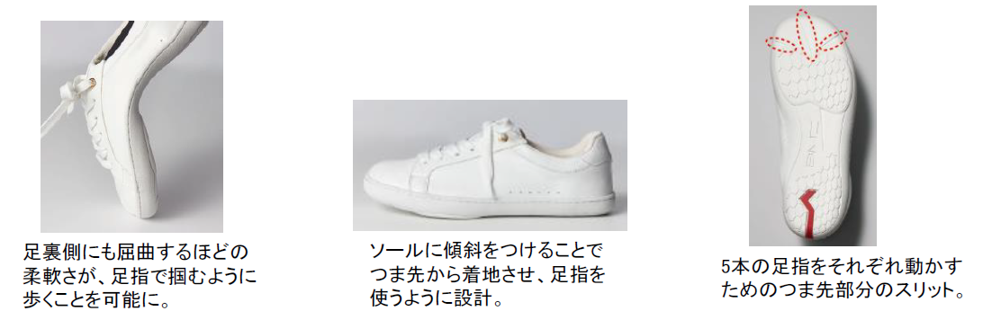 - 【特長2】足指で地面を掴むように歩ける特殊なアウトソールを開発