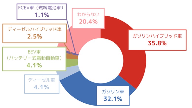現在の車を買い替えることになった場合、新しい車にどういった車種を選ぶかを聞いたところ、「ガソリンハイブリッド車」が35.8%、「ガソリン車」が32.1%とBEV車の優先順位はまだ低いことが分かりました。