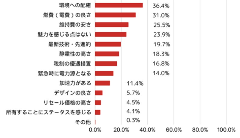 電気自動車(BEV車)のどんな点に魅力を感じるかを聞いたところ、「環境への配慮」が36.4%でトップ、続いて「燃費(電費)の良さ」、「維持費の安さ」と続きました。近年の持続可能な社会の実現に向けた社会の風潮が反映されつつ、燃費や維持費など実用的な面での評価も得る結果となりました。