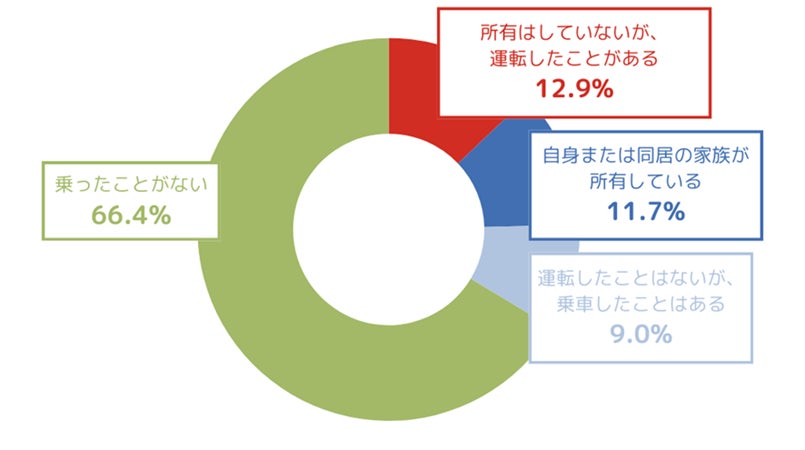 電気自動車(BEV車)を所有又は運転、乗車したことがあるかを聞いたところ、「乗ったことがない」が66.4%でトップになりました。「所有はしていないが、運転したことがある」が12.9%、「自身または同居の家族が所有している」が11.7%、「運転したことはないが、乗車したことはある」が9%と、3割以上が電気自動車に乗車したことがあることがわかる結果となりました。